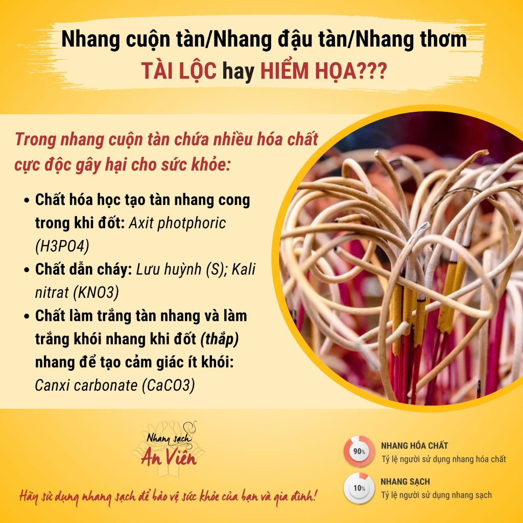Ngày nay, trên thị trường tràn lan các loại nhang giá rẻ được tẩm hóa chất tạo mùi, tạo khói. Khi đốt lên, những cây nhang này không chỉ tỏa hương mà còn thải ra hàng loạt khí độc như formaldehyde, lưu huỳnh, CO và benzen – những chất có thể gây đau đầu, khó thở, kích ứng mắt mũi, và lâu dài còn ảnh hưởng đến phổi, gan, thậm chí là ung thư.